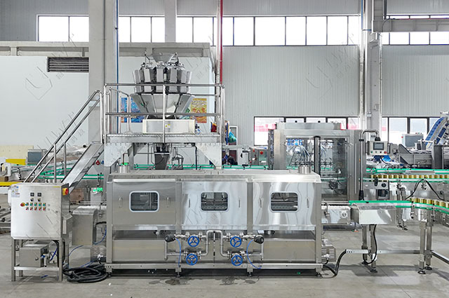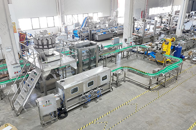 鼓泡清洗-預(yù)煮—振動(dòng)瀝水——固體物灌裝——液體灌裝——封口機(jī)——實(shí)罐清洗——稱(chēng)重檢測(cè)——自動(dòng)封箱