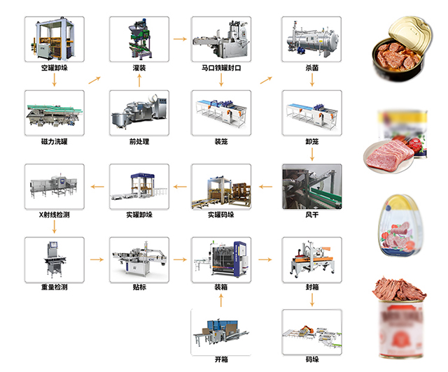 肉罐頭的生產(chǎn)工藝主要包括以下幾個(gè)步驟:原料處理、切塊、復(fù)檢、拌料、裝罐、排氣密封、殺菌冷卻、擦罐入庫(kù)。每一步都是確保產(chǎn)品質(zhì)量的重要環(huán)節(jié)。